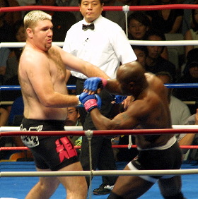Fujita has a huge mellon and a very good chin in Pride. No one in Pride hits as hard as Mirko though. If it is a stand up fight I pick Mirko, if it is a MMA match Fujita will take Mirko down and grind him into a smear in the canvas. Fujita took Mark Kerr down so Mirko won't be able stop the take dowm unless he gets the one clean shot.