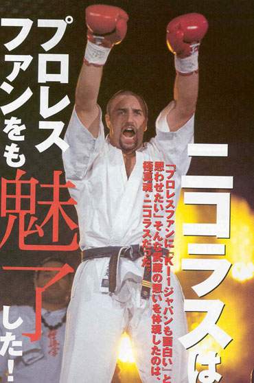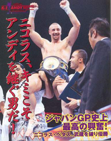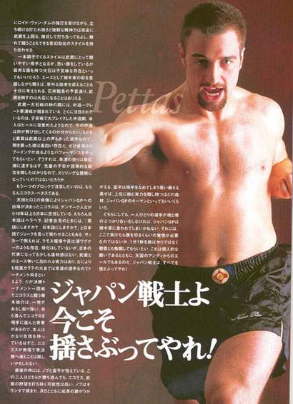 my japanese isn't so good but the pettas pic with the karate-gi and two handed pose says "pettas tells pro-wrestling fans that k-1 is interesting".