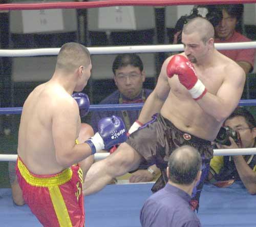 Nicholas Pettas doing the Andy Hug AxeKick at the Andy Hug Memorial 2001 Cup.