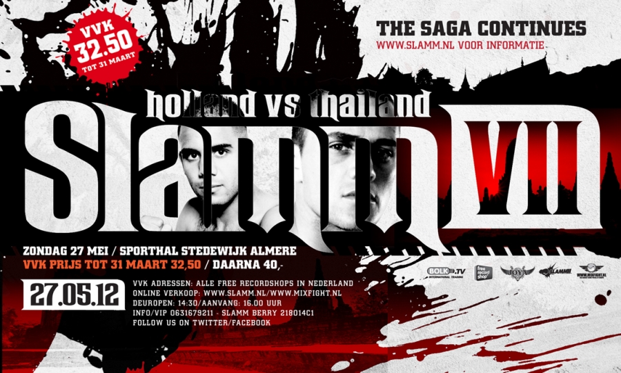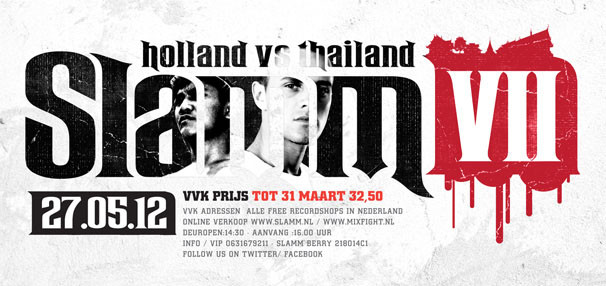 For part VII, which is now planned to be held in the Sporthal Stedenwijk in Almere, Slamm!! has a lot in store once again. We are going back to the roots, especially since the first Slamm!! event was also held in this location where Marco Pique fought against Buakaw Por Pramuk. In a sold out hall this huge matchmaking should once again be achievable. Instead of launching the entire matchmaking we have decided that this time the promotion of the event will be combined with a contest. We hereby launch a number of names of the fighters of the “Holland vs Thailand” and the “Best of Holland” programme. The person who is able to put together the entire matchmaking of “Holland vs Thailand”, in else the four fights, will be the winner of two free entrance cards. To prevent any confusions, there are 12 fighters, of which 4 will not fight in the “Holland vs Thailand” programme, but who will participate in the “Best of Holland” programme. Put together the list in this topic and who knows you might be one of the first to win two cards. The remaining fans have the opportunity to buy their entrance cards for the special pre-sale price of Euro 32,50 until the 31st of March. These cards are available at all Free Record Shop branches ,online on the Slamm!! Facebook and Mixfight.nl