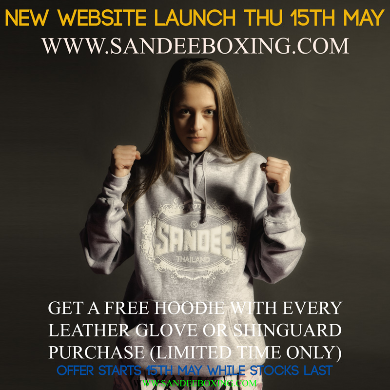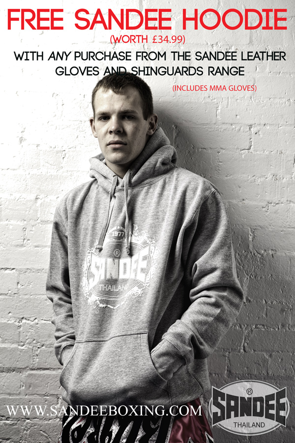 We are giving away a free SANDEE Hoodie (worth £34.99), with any purchase from the SANDEE leather boxing GLOVES, or leather SHINGUARDS Range.