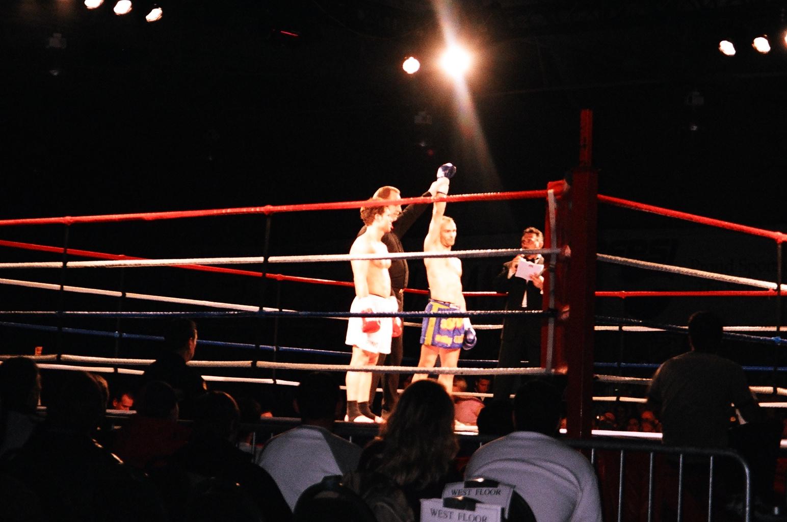 The final started off oddly as Brackenbury’s name was announced and it took him 5 or 6 minutes to actually walk down to the ring. Trevor came down to the now familiar refrain of TNT by ACDC. Smandych started off with some nice middle kicks. Brackenbury is strong as well throwing combos with hands and feet to the body and head, though it should be noted that Trevor shelled nicely for most of Brackenbury’s flurries. Trevor on the whole was the more aggressive fighter who initiated the exchanges.